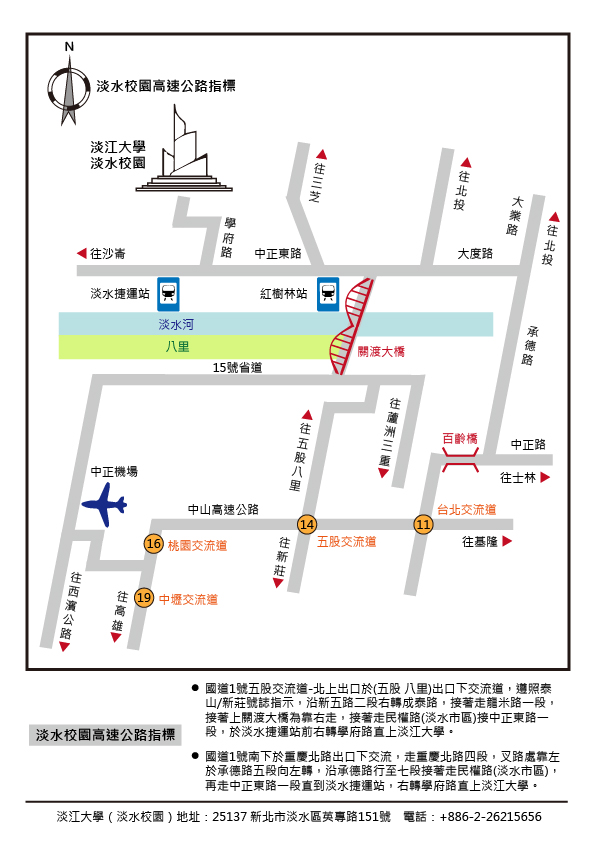 中山高速公路北上:台中→新竹→台北→五股交流道→往五股八里方 向→過關渡橋往西→淡水→淡江大學淡水校園